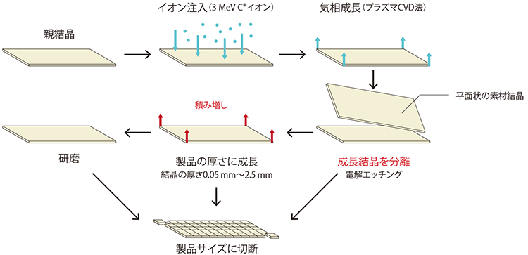 一つが、ガスからダイヤモンド結晶を合成する「気相合成法」により、ダイヤモンドデバイスの開発に必要な、10 mm角を超える大型のダイヤモンドの合成が可能になったことである。二つ目の成果は、イオン注入を用いて成長させた単結晶を種結晶から分離させる方法で、これにより、種結晶を何度も使って、同じ大きさの単結晶を製造できるようになった。さらに、この方法で得られた複数の単結晶ダイヤモンドをモザイク状につなぎ合わせることで、大面積の結晶もつくれるようになった。