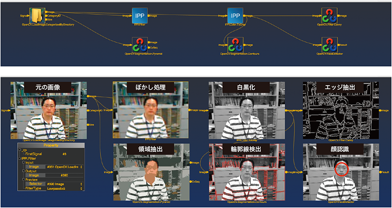 画面上に画像処理を指示するアイコンを置き、任意の順番につなげる(上図)だけで、さまざまな画像処理を行える(下図)プログラムを、簡単に作成・カスタマイズできる。