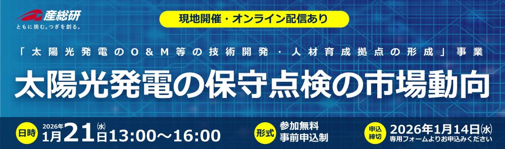 国立研究開発法人 産業技術総合研究所(以下、産総研)再生可能エネルギー研究センター 太陽光システム研究チームでは、福島県における再生可能エネルギーの導入促進のための支援事業費補助金「太陽光発電のO&M等の技術開発・人材育成拠点の形成」事業の一環として、福島再生可能エネルギー研究所(FREA)に設置されている太陽光発電設備を活用し、オペレーション&メンテナンスの技術開発および人材育成を行っております。 本事業の一部として、太陽光発電の保守点検の市場動向に関するセミナーを以下の要領で実施します。ふるってご参加ください。