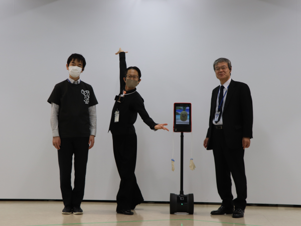 アバターロボットに乗り込んだ参加者を出迎える廣島洋柏センター所長